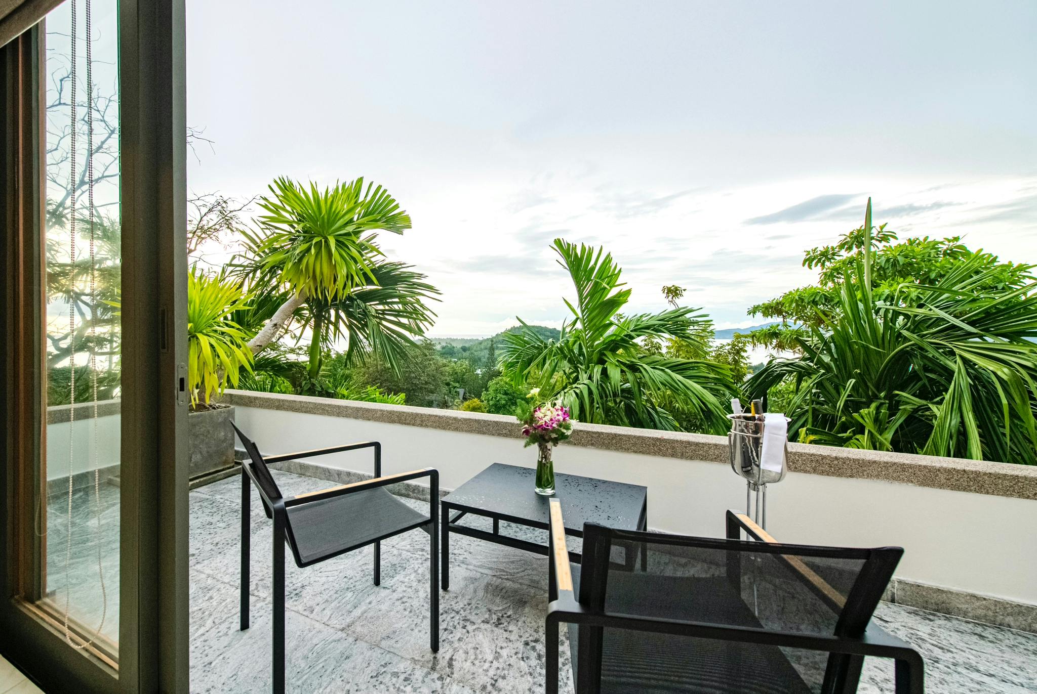 The spacious Studio room features a a large sitting area, balcony with ocean view, and air-conditioning. This room has a deep soaking bath tub and separate shower.